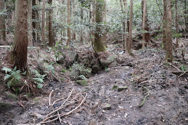 森の中にあるものや炭を使って整備。谷筋の読み方、どこから水が出てくるかを考えながら掘ったり重ねたり。