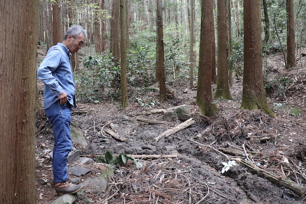 高田さんが土を掘ると、森の水分状態があまりよくないことがわかります。