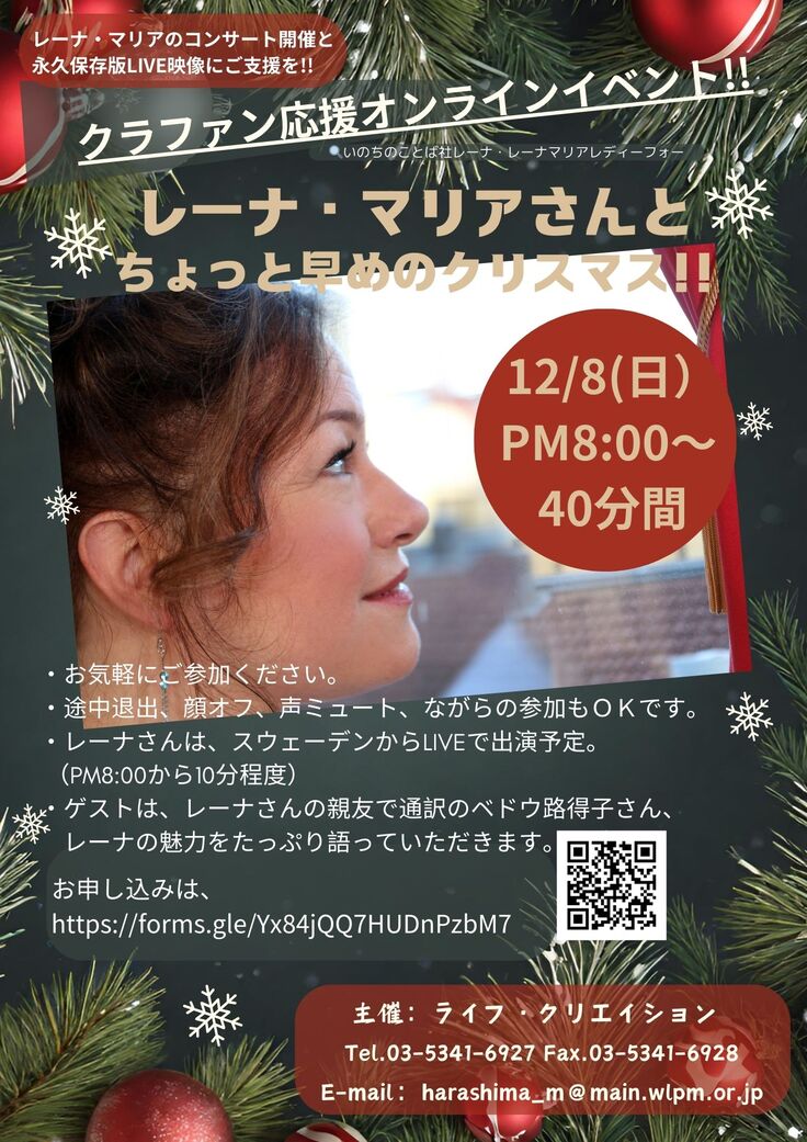 クラファン応援オンラインイベント!! 『レーナ・マリアさんとちょっと早めのクリスマス!!』ご招待!!