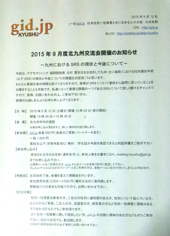 9月13日 日本性同一性障害と共に生きる人々の会 九州支部 主催の9月度交流会に参加しました。