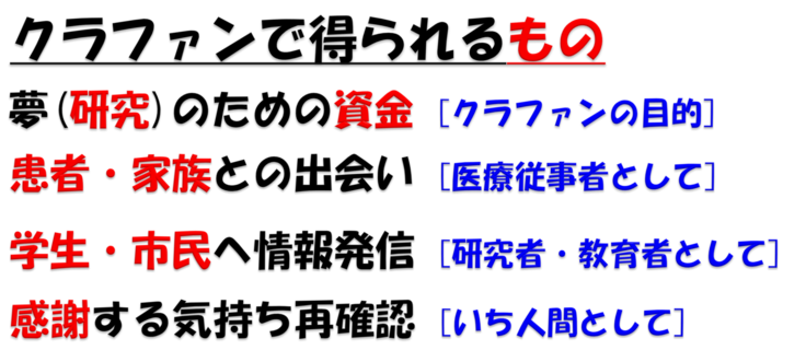 研究者が自身の研究対象としている病気の患者・家族の皆様との接点が少ないので、双方向につながる機会が得られるクラファンは、私達にとっては研究のモチベーションになりますし、患者・家族の方々には希望になるかもしれないと期待しております。