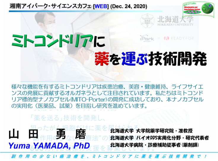 2020年12月24日のクリスマスイブに湘南アイパーク・サイエンスカフェでお話をさせて頂く機会を得ました。クラウドファンディング活動後に、湘南アイパークのコミュニティの皆様にご挨拶する初めての機会でもありました。スペシャルエディションとして、30分の講演の後にDrug Delivery System (DDS)と創薬に関する座談会も企画して頂きました。サイエンスカフェの事務局からも許可を頂き、山田の講演動画を配信させて頂くことになりました(音声が途切れている箇所もあり申し訳ございません)。コロナ禍で直接皆様にお話をさせて頂く機会がなく非常に残念ですが、このような機会を頂けましたのでご興味がある方は是非ご覧頂けましたら幸いです。