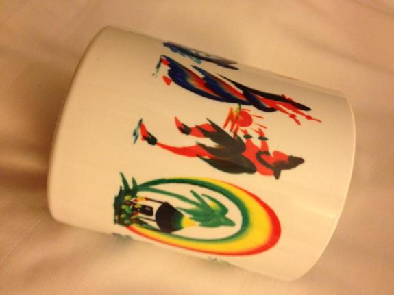 ・アルファベットがハワイをモチーフにした絵(フラガール、虹、植物、イルカなど)で成っているマグカップまた表札等のハワイアングッズ