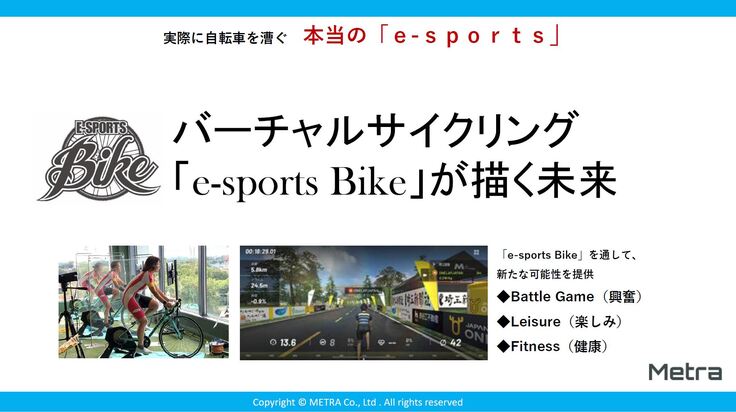私たちは、このe-sports BIKEを通して「ヘルスケア」「ツーリズム」「コミュニケーション」などにおいて新たな可能性を広げていきたいと考えております。