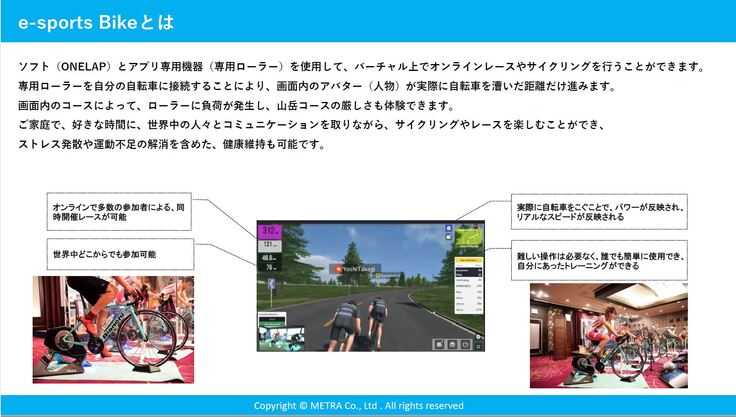 これらを解消するためバーチャルオンラインサイクルソフトを使用した「e-sports BIKE」の普及を行っております。