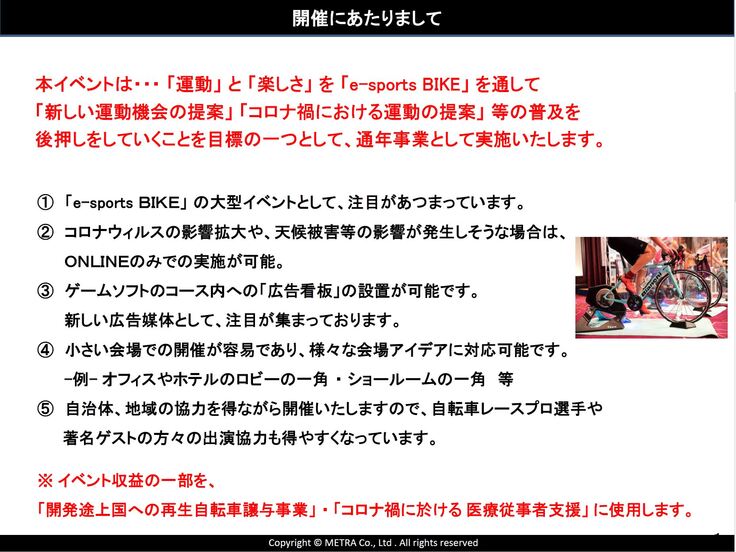 長年携わってきた「自転車業界」の産業発展に貢献したい。コロナ禍・異常気象下での新しいスポーツの形を追求し健康促進に貢献したい。と考えてこのプロジェクトを立ち上げました。