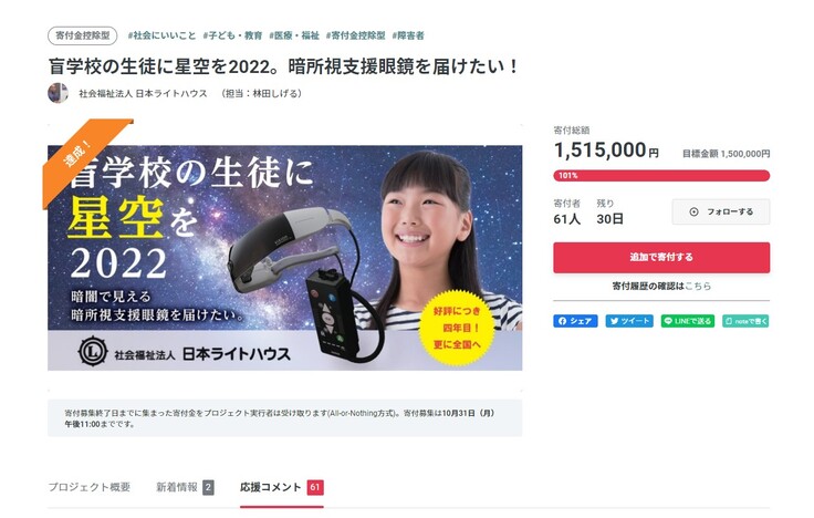 目標金額150万円を達成することができました。心より御礼申し上げます。