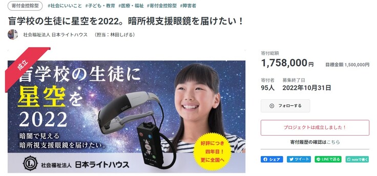 この度は、「盲学校の生徒に星空を2022」のご支援誠にありがとうございました。