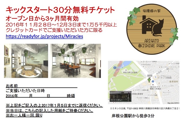 保護猫の家キックスターターとして、特別にオープンから3ヶ月以内に使える