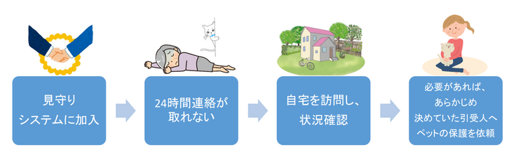 飼い主が事故や脳梗塞、心臓発作などの病気により、急に倒れた際に自宅に残されてしまったペットを守る、新たなシステムです。 犬や猫だけでなく、ウサギやハムスター、鳥類や爬虫類など、許可が必要な特定動物でなければサービスを利用することができます。