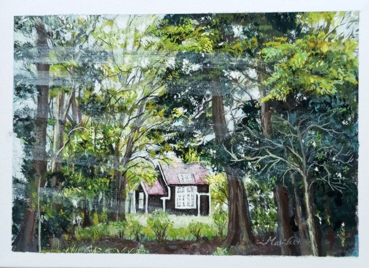 鬱蒼と生い茂る木々の間から太陽の光の束が差し込むその奥に彝アトリエが垣間見え、光と空気を意識して描かれたとの説明どおり、はっきりと見て取ることができる作品です。
