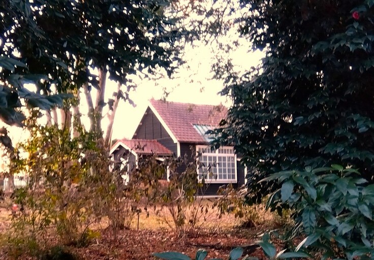 アトリエの手前の紫陽花やクマザサも今ほど大きくはなっていませんが、光の差し込む作品の左側には大木が立ち並んでいます。