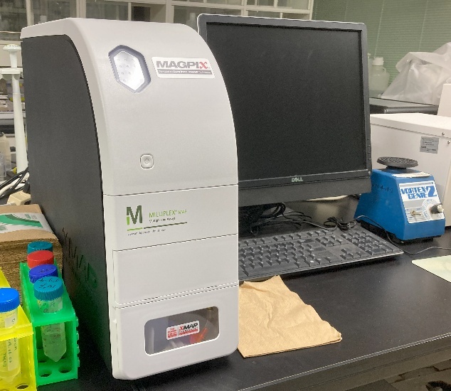 MAGPIX装置(製造修了) ビーズの蛍光色と抗体の蛍光を用いて、多検体(多くのサンプル)を一括で解析できる装置。 現在は製造修了となってしまったが、短時間で多検体を解析でき、必要サンプル量および廃液量が少ないのが長所。 |