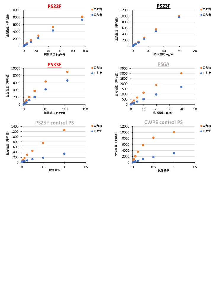 工夫した内容に関しては未発表のため本報告に詳細を記載できないが、PS25F、PS6AならびにCWPSに対する標準血清中の抗体による非特異的吸着が大幅に抑制できた。個々の抗原に対する抗体の吸着がこの工夫により影響を受けるかに関しても検討した(図2)。