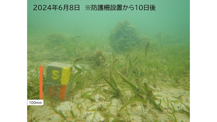 一枚目は柵が完成して10日後の写真。10㎝のスケールを少し超えるくらい13~15㎝くらいかなというウミショウブが写っています。