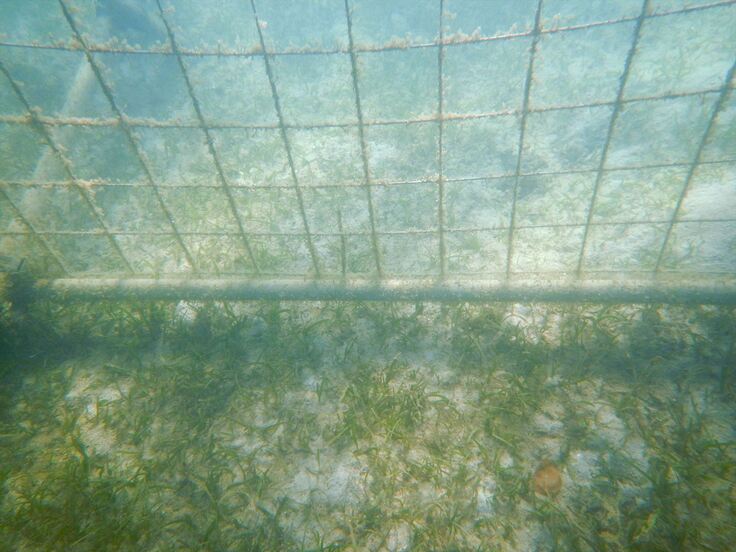 柵の境界で海草の育ち具合にはっきりとした差が見られます。