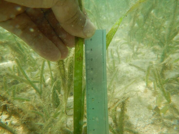 アオウミガメが入らないようにする柵を設置しただけでウミショウブやそのほかの海草が想像以上にぐんぐん伸びてくるので、どれくらいの成長速度なのか測定してみました。海草の研究者から聞いた方法で、海草に針で穴を開けて目印とし、時間を開けて長さを測るというシンプルな方法です。