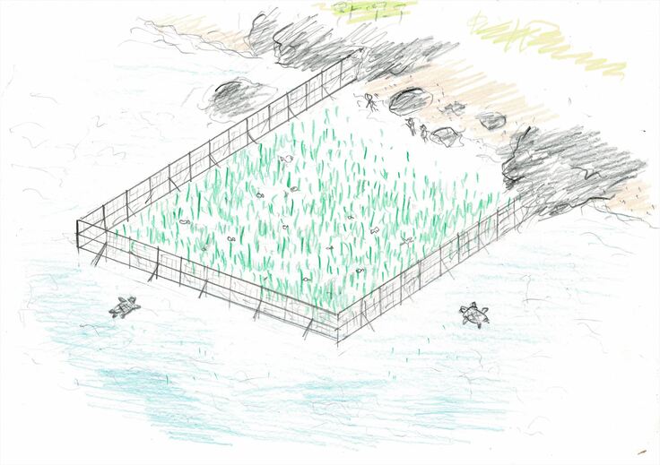 せめて、柵で囲った範囲内だけでもウミショウブが青々と茂る健康な海草藻場を取り戻したいなという想いで描きました。