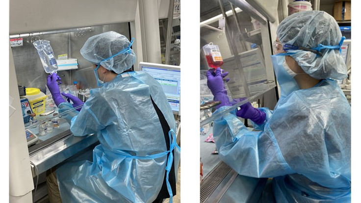 また、抗がん剤は、体重、体表面積、腎臓の機能などで投与量が決まる薬剤が多く、患者さんお1人お1人にとって適切な量をml、mg単位まで計算しています。薬剤師は投与量が適切であるかを確認した後、特別なキャビネットの中で、写真のようなガウン、帽子、マスク、手袋をつけて抗がん剤が皮膚などにつくことを防ぎながら、清潔かつ安全に抗がん剤の調製をしています。