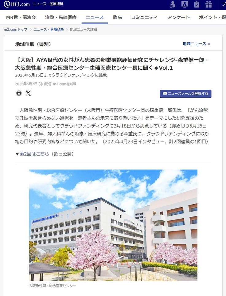 昨日、m3.com 地域版 に 「【大阪】AYA世代の女性がん患者の卵巣機能評価研究にチャレンジ-森重健一郎・大阪急性期・総合医療センター生殖医療センター長に聞く◆Vol.1」の記事が公開されました。(2回目は、5月12日配信予定)