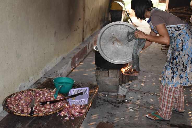 今日は、お弁当を作り、地震で壊れた家や建物、お寺、母子ケアセンターの片付けを行っているボランティアや母子ケアセンターのスタッフ、地区の人々に、OISCAのパン、お弁当、飲み水を一つずつ配布しました。