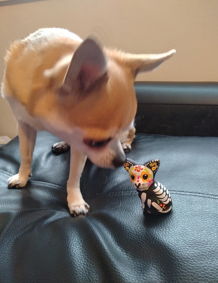 メキシコ雑貨店に可愛いチワワの置物がありお迎えしました。