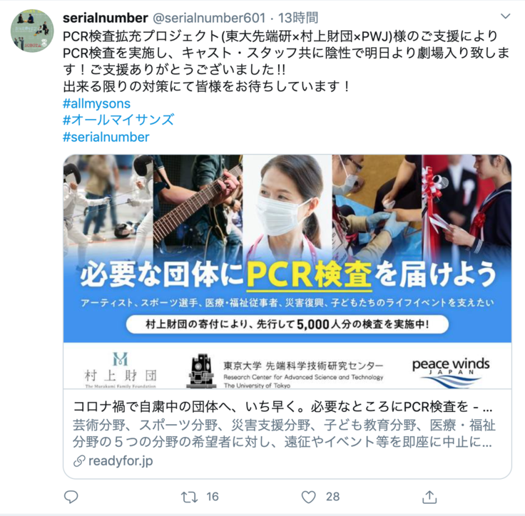 応援ありがとうございます。PCR検査拡充プロジェクト実行委員会です。
