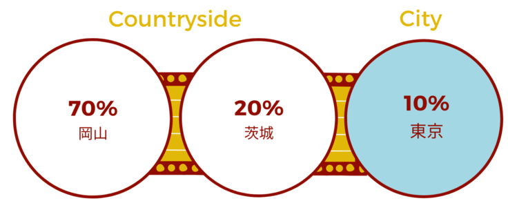 岡山県全域(70%)、東京(20%)、茨城(10%)