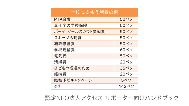 今回はクラウドファンディングで集めたお金を認定NPO法人アクセスさんを通してフィリピンの子どもたちの教育のために寄付させていただきます。なお、認定NPO法人アクセスさんには事前にこのプロジェクトの内容についてお話しし、企画への協力、名称掲載の同意をいただいています。