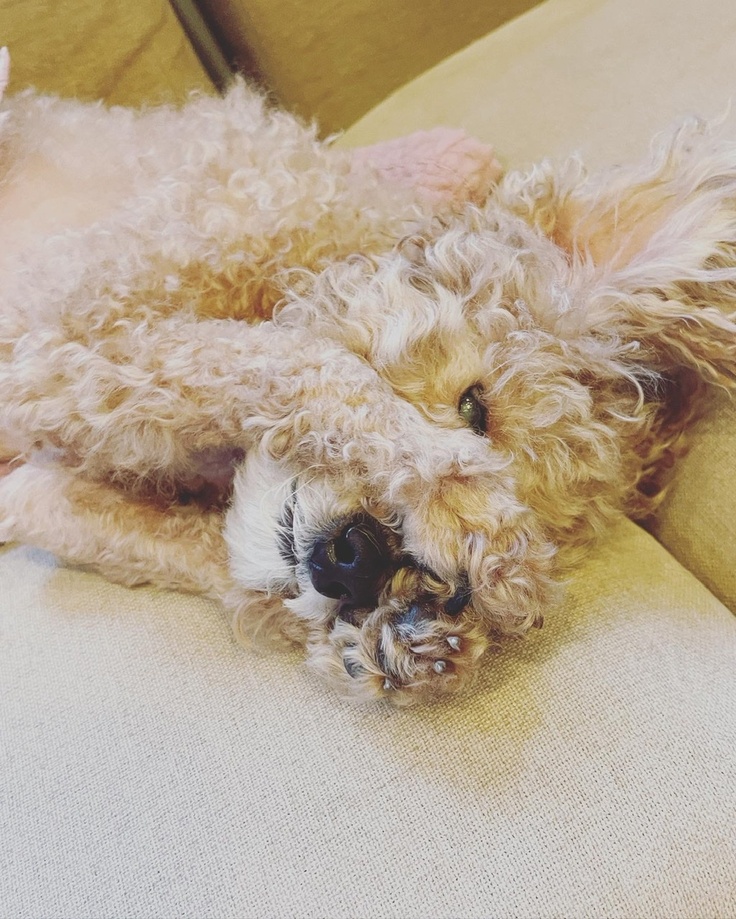 今朝はベランダでクンクンと少し外の空気を吸って、自ら部屋に戻りソファにゴロンとしていました🐶