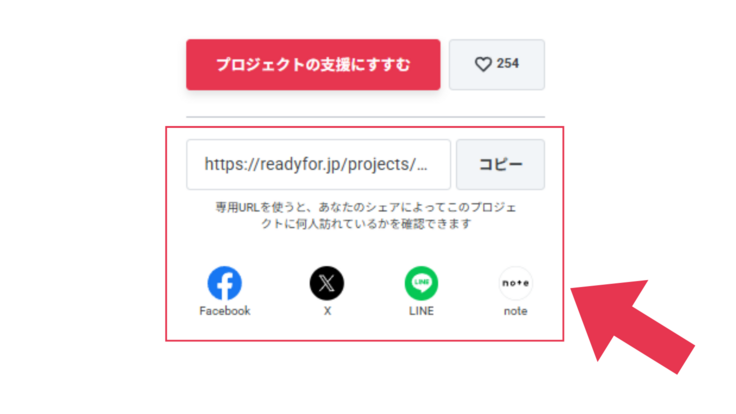 プロジェクトページ左上にある「専用URLを使うと、あなたのシェアによってこのプロジェクトに何人訪れているかを確認できます」の下にあるFacebook、X(旧Twitter)、LINE、noteのアイコンから簡単にシェアできます!