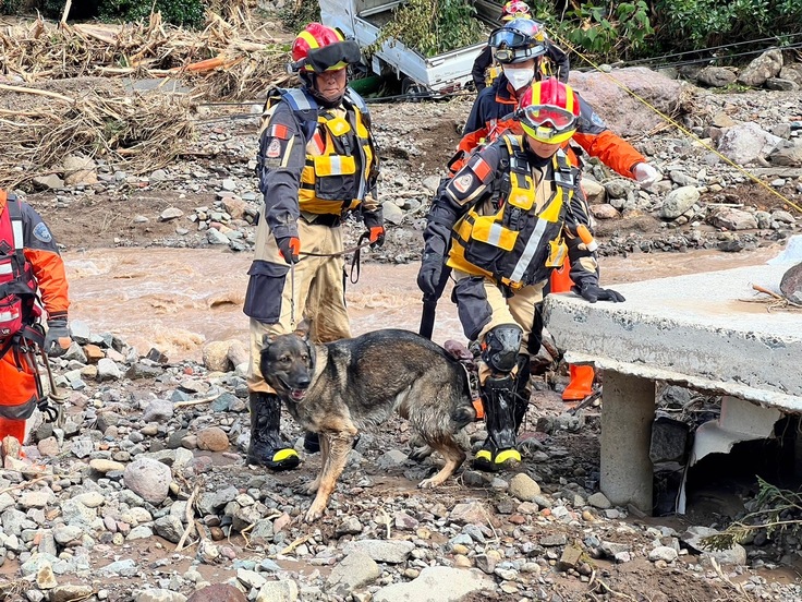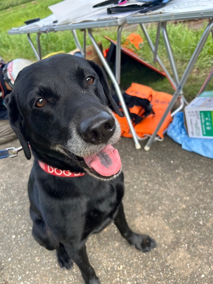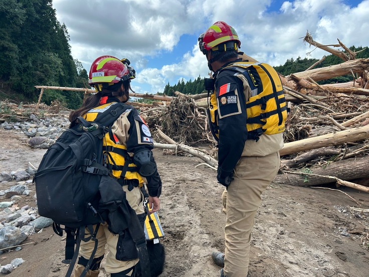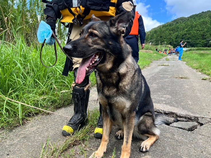 いずれも発見には至りませんでしたが、災害救助犬の太陽、陸、カミ一ノ、楽は濁流や土砂など足場の悪い中、懸命な捜索をしてくれました。