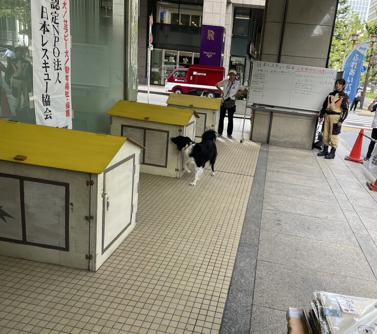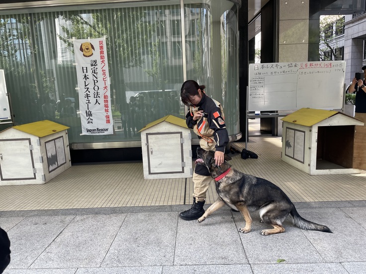 おそらく、災害救助犬たちもオフィスが立ち並ぶ場所でのデモは初めて!