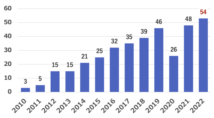 2020年はちょうど2月に新型コロナウイルス感染症の流行の影響で1回目の緊急事態宣言が発出されたこともあり、開催イベント数が激減しますが、その後は数を戻し、2022年のRDDは過去最大の54のイベントが開催されました。