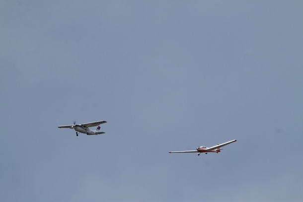 上空をフォーメーションで通過する学園のCessna T206とScheibe SF-25c Falke。
