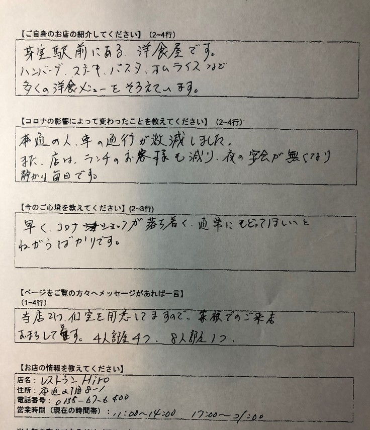 コロナで厳しい飲食店へ支援金を!芽室町の飲食店をみんなで応援