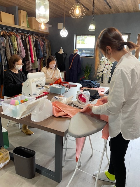 現在5人のママたちが週に2~4日ほどお仕事に来ています。着物リメイクや小物つくり、近くのインポート会社のチョコレート包装のお仕事をしています。