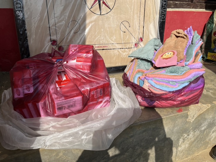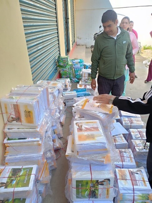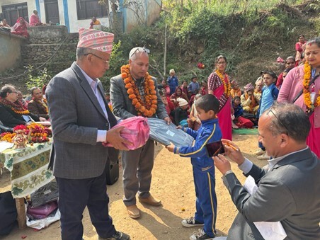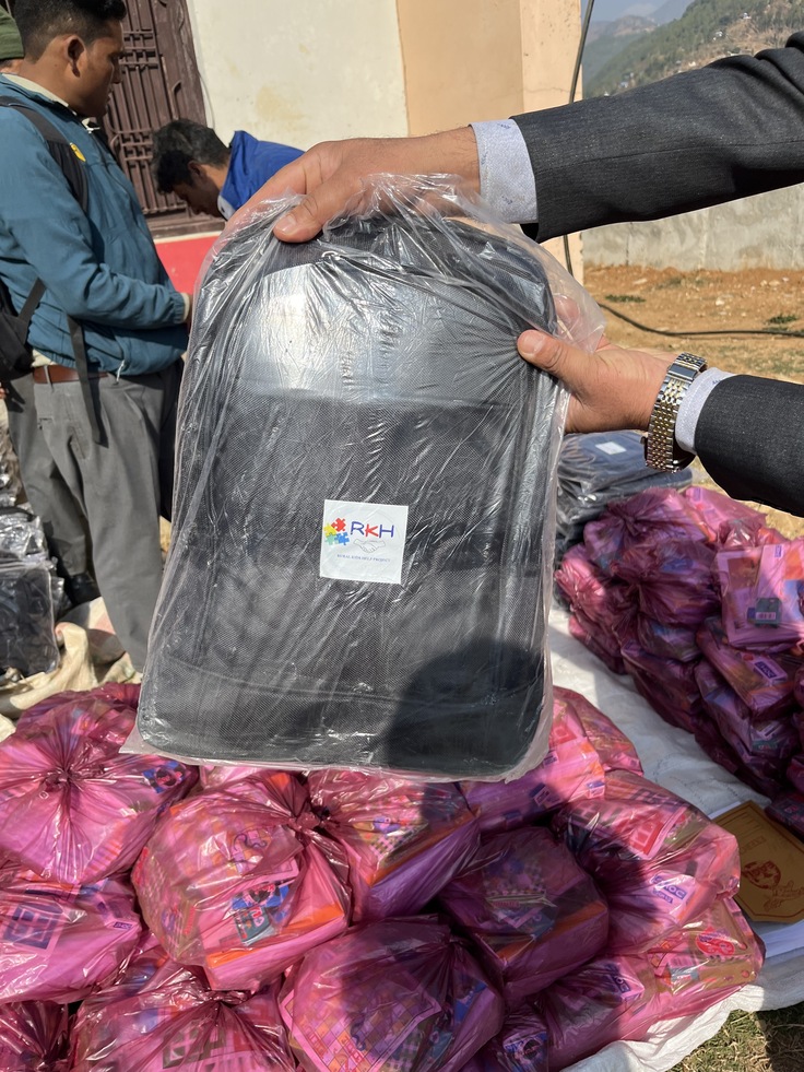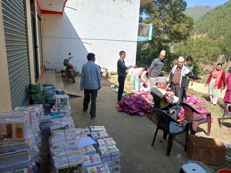 This year, many of the materials were purchased locally in Pyuthan and transported to the schools. However, toothbrushes and toothpaste were brought from Japan. Here are scenes from the preparation of donated items and the donation ceremony at the local site.