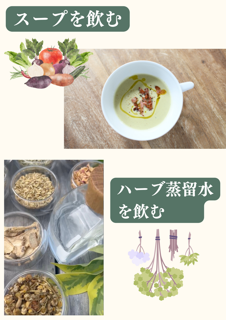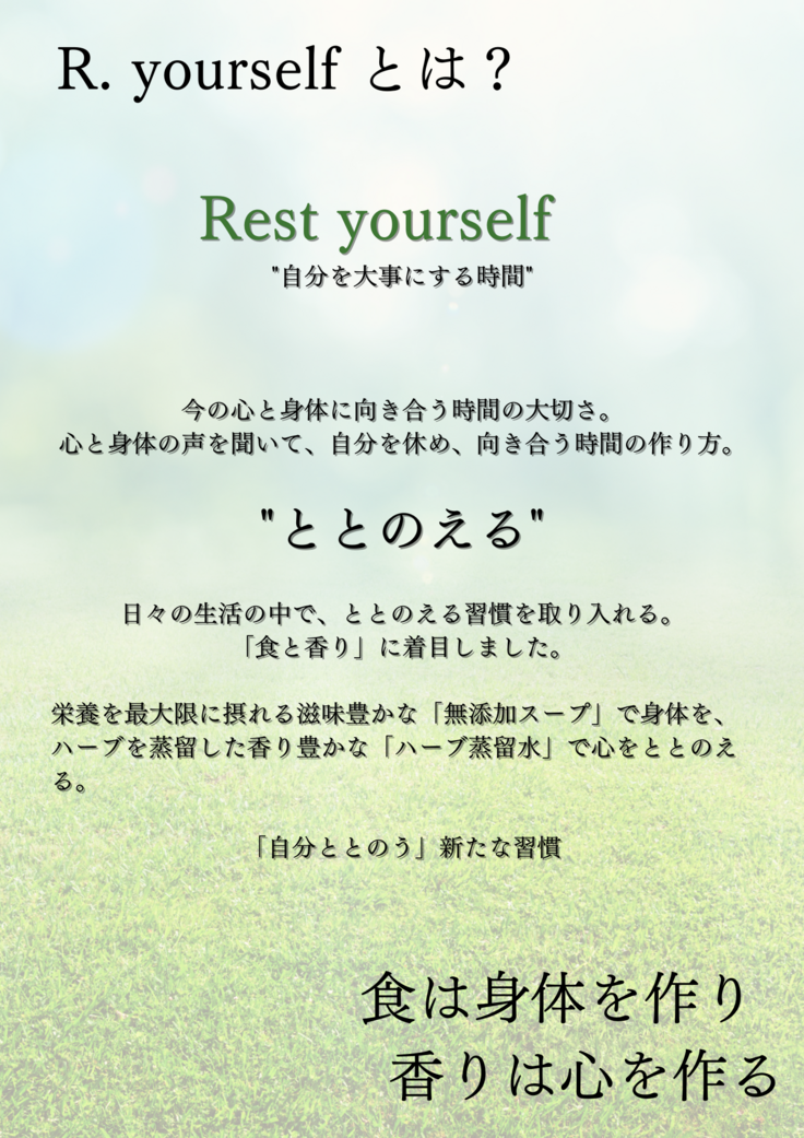 なんとなく体調がすぐれない時、忙しい時にも簡単にととのえることができるのが、注いで飲むだけのスープとハーブを蒸留した香り豊かな芳香蒸留水です。これらを日々の食事に取り入れると身体がととのってきます。つまり、簡単に、食と香り、2つの側面から健康へのアプローチができるということです。食は身体を作り、香りは心を作ります。心と身体は繋がっています。スープと芳香蒸留水を取り入れることで、心と身体のバランスをととのえることができ、ひいてはそれが未病改善につながります。この先の未来、1人でも多くの方が、自分の健康、家族の健康を自分自身で作り出しいつまでも生き生きと健康に過ごせる人を増やすことが展望です。