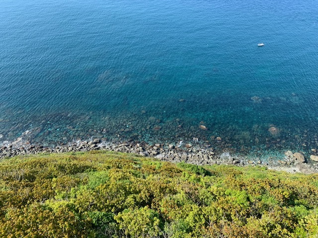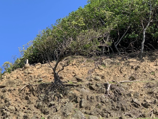 海も山も一見すると青く美しく見えますが森に入ると赤土がむき出しになり土砂崩れのため川が埋まり山の栄養をもらえない海岸の岩は着生生物が死にツルツルになって生き物の姿はありませんでした。