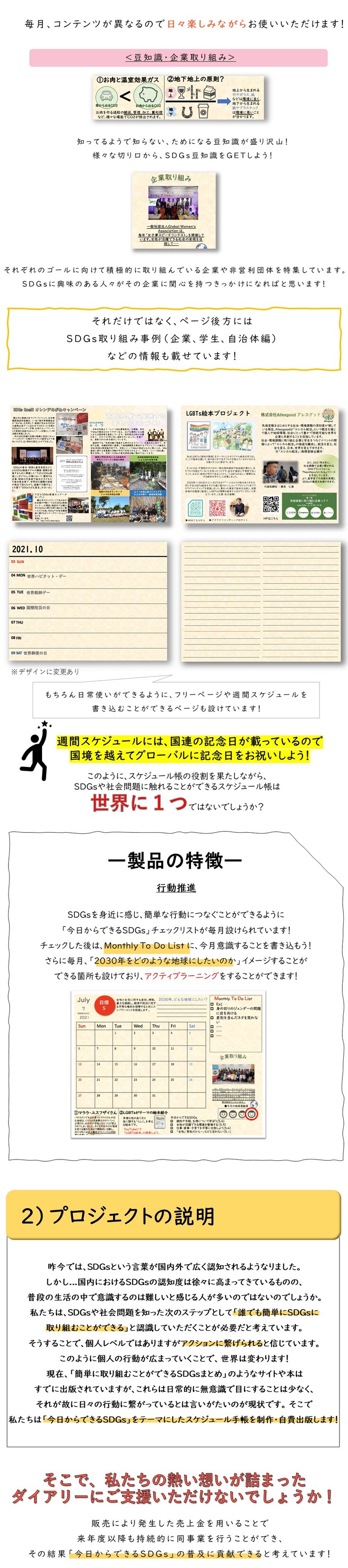 ネクストゴールを1週間で達成することができました。そこで、より一層「環境にやさしい材質・手法で作ったSDGsダイアリー」を「より多くの人々に」届けたいと思い、今回ファイナルゴールとして、目標金額100万円と支援者数200人を目指すことと致しました。