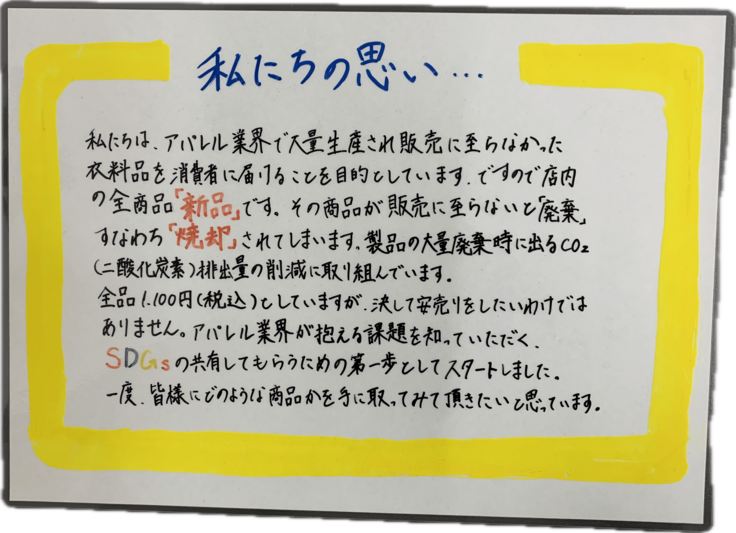 当店では、アパレル業界で過剰在庫となった衣料品の販売だけではなく、SDGsの啓発活動を行っています。