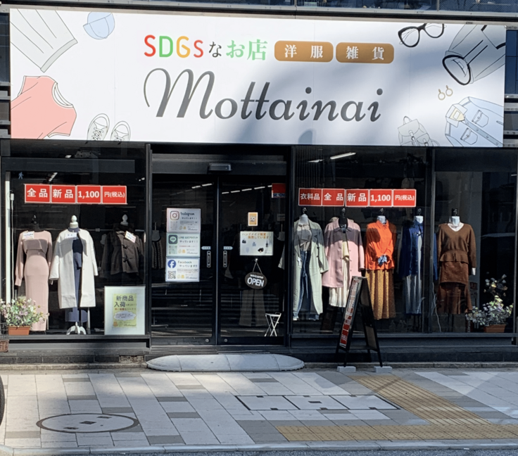 「SDGsなお店Mottainai」は、環境分野のSDGsの視点でアパレル業界で過剰在庫となった新品衣料品を廃棄せず、焼却することなく販売をするため、2023年11月に兵庫県尼崎市にてオープンしました。