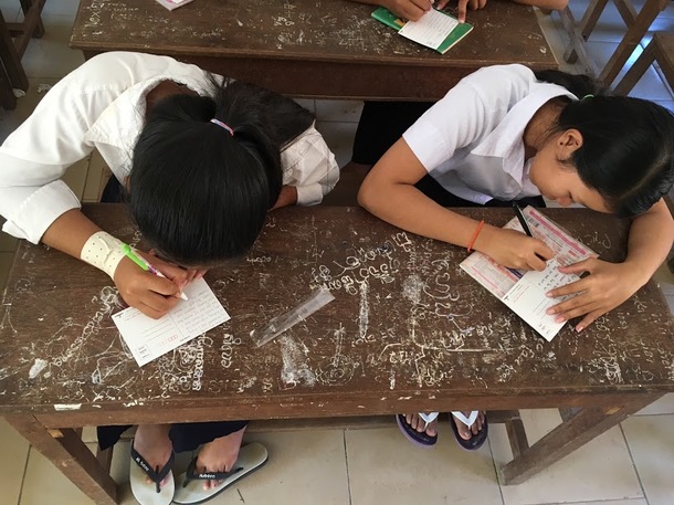 (持って行った絵葉書にメッセージを書いているところ)