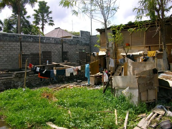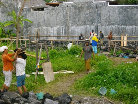 バリ島の近隣の島々から(ジャワ島や近隣の島々)仕事を求め働きに来た人々は、この期間内、横の空き地に生活の場をつくり、中には家族で子供も一緒に来て、毎日、仕事をしながら水を浴び、ご飯を作り、洗濯をし皆で生活の日々を送ります。ある一定の期間になるとチームは入替わりますが、仕事も賃金も必ずしも安定も保証も全くありません。