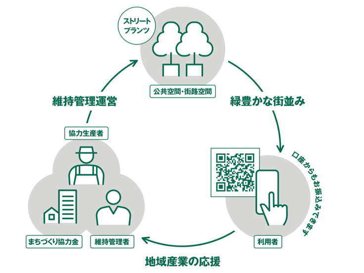 ストリートプランツは、生産者と都市緑化を繋ぐ、流通型緑化の応援プラットフォームです。生産と流通の間にストックされている植木を、公民が連携してマチナカに設置管理できる持続的な仕組みを支援します。近郊農業地域で生産される植木を用いることで、地産地消による地域産業の好循環とPRにも寄与することができます。