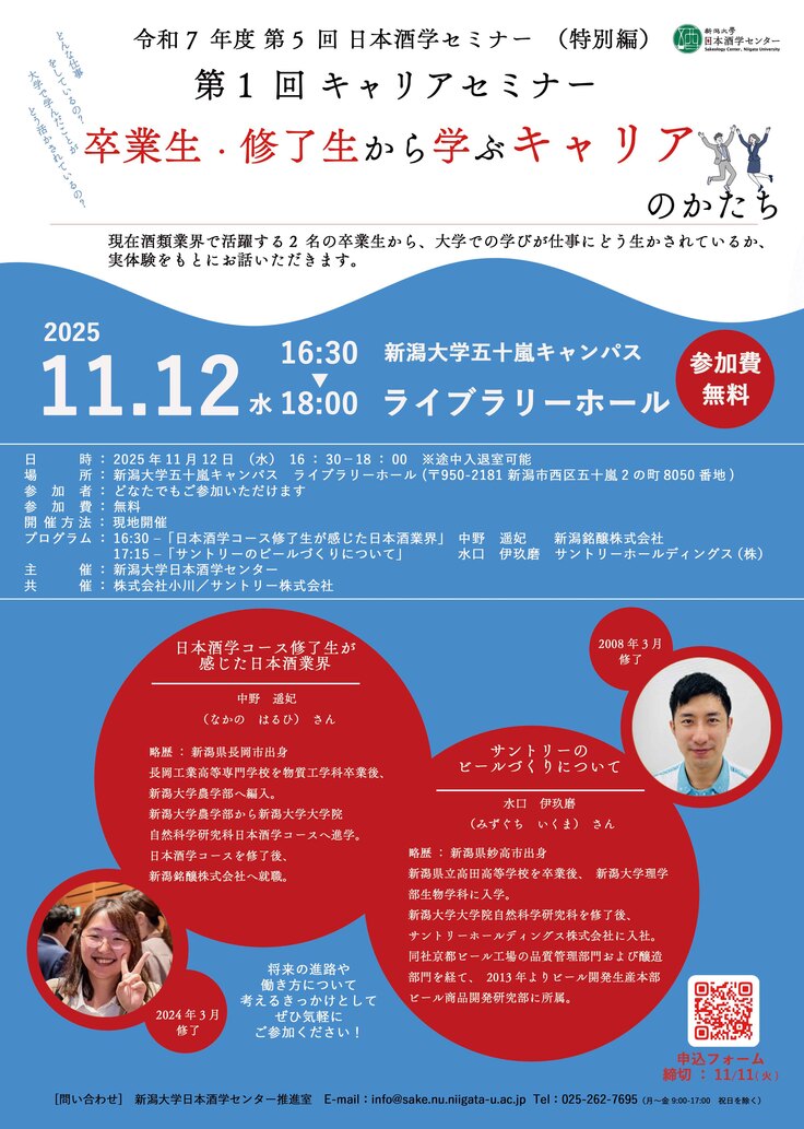 11月12日(水)16時30分より、新潟大学五十嵐キャンパス ライブラリーホールにて、令和7年度 第5回 日本酒学セミナー(特別編)として、「第1回キャリアセミナー 卒業生・修了生から学ぶキャリアのかたち」を開催いたします。