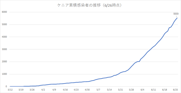 ケニアにおける感染者数は、累積で5500名を越え、5533名にまで膨れ上がりました。新規感染者の数が200名を超える日も散見され、流行に歯止めがかからない様子が見て取れます。夜間外出などの感染拡大防止措置はいまだに取られていますが、街の人通りはかなり戻ってきています。「働かなければ飢えるのみ」といった認識は広く浸透し、不安を抱えながらも外出し、経済活動に従事せざるを得ないのが現実です。
