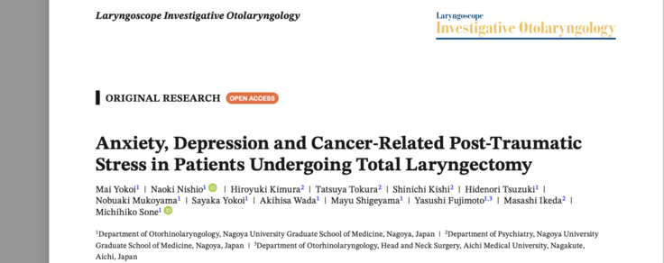 喉頭摘出術を受ける患者さんも、災害とは異なりますが、手術の前にかなりの心的外傷ストレスを感じます。「がんに対する自分の命への不安」と「自分の声がなくなってしますこと」に対して非常にショックを受けることが多いです。私たちのグループは、喉頭摘出術を受ける患者さんがどのくらい心的外傷性ストレスを感じているかを、15年間の名大病院でのデータをまとめて報告しました。驚くことに手術前には、約3割くらいの患者さんがPTSDの可能性がある結果でした。やはり喉頭摘出術を受ける前にはそのくらいの不安を抱えていますので、自分の声を保存しておくことまでは、考えることができないと思います。少しでもこのプロジェクトの存在によって、その不安が和らいでくれることを願っています。