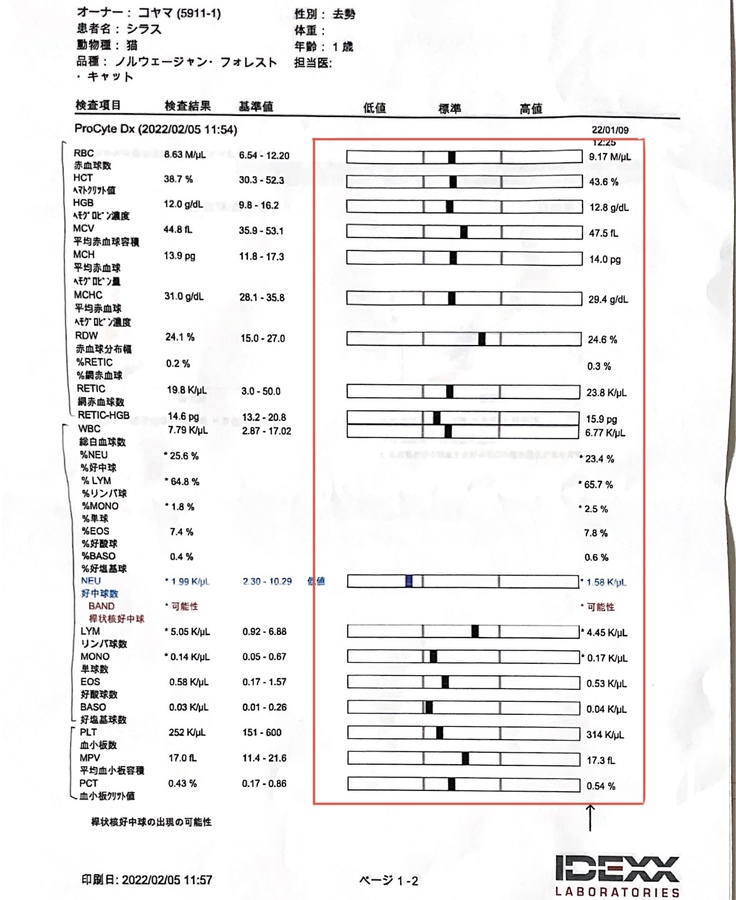 赤血球、白血球、血小板も正常でした!数値を見ていると本当に治療の終わりが近づいているんだと感じます!長かった闘病生活もあと少しです!本日外注に出しているもう一つ大事なA/G比の検査結果も後日連絡を頂けるので、分かり次第ご報告致します!
